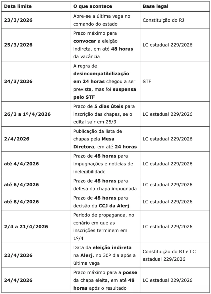 Um dos pontos ainda em aberto envolve as regras de desincompatibilização. O trecho aprovado pela Alerj que previa prazo de 24 horas para afastamento de cargos foi suspenso pelo ministro Luiz Fux, do Supremo Tribunal Federal. Apesar disso, o cronograma principal permanece válido, com eleição prevista para abril sob condução indireta do Legislativo estadual.